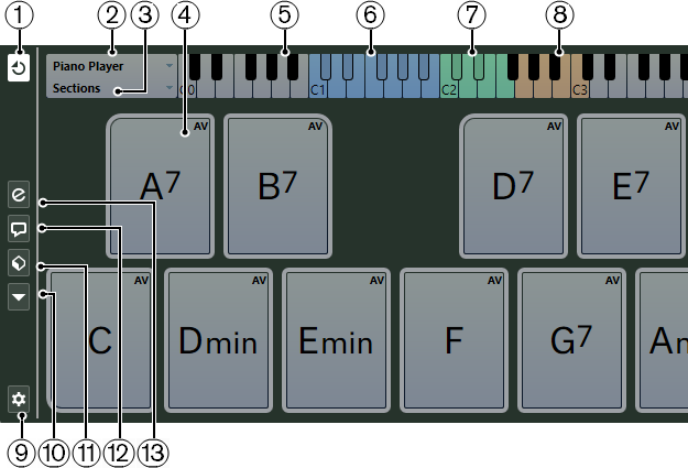 Las teclas resaltadas en azul en el teclado, corresponden a teclas en su teclado MIDI que disparan los pads de acorde. Puede definir el rango remoto en la página Control remoto de pads del diálogo Configuración de pads de acorde.