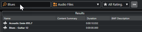 Wenn Sie beispielsweise nach Audio-Loops suchen, die Drum-Sounds haben, geben Sie einfach »drum« in das Suchfeld ein. Das Suchergebnis enthält Loops namens »Drums 01«, »Drumloop«, »Snare Drum« usw. Es werden auch alle Mediendateien der Kategorie Drum&Percussion gefunden sowie jedes andere Attribut, das »drum« enthält. Sie können zusätzlich Anführungszeichen eingeben, um genaue Übereinstimmungen mit den eingegebenen Wörtern zu erhalten, und Sie können boolesche Operatoren verwenden.