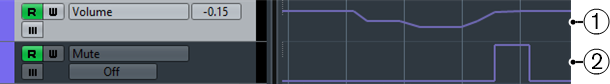Dentro de un proyecto de Cubase, los cambios en un valor de parámetro sobre el tiempo se reflejan como curvas en pistas de automatización.