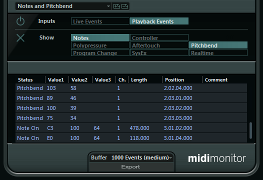 En la tabla de la sección inferior de la ventana puede ver información detallada acerca de los eventos MIDI monitorizados.