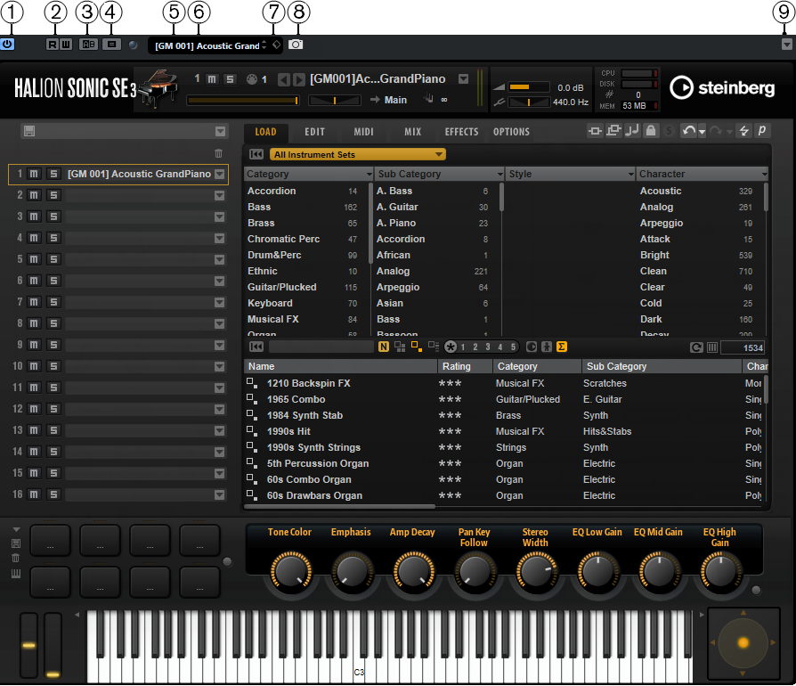 The VST instrument control panel allows you to set up the parameters of the selected instrument. The contents, design, and layout of the control panel depend on the selected instrument.
