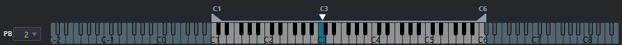 Im Keyboard-Bereich der Sampler Control können Sie den Grundton und den Tonumfang des Samples sowie den Modulationsbereich des Pitchbend-Rads an Ihrem MIDI-Keyboard einstellen.