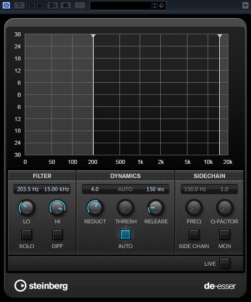 If this button is activated, the look-ahead feature of the effect is deactivated. Look-ahead produces more accurate processing, but adds a specific amount of latency as a trade-off. If Live mode is activated, there is no latency, which is better for live processing.