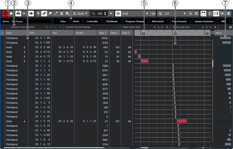 The List Editor shows all events in the selected MIDI parts as a list, allowing you to view and edit their properties numerically. It also allows you to edit SysEx messages.