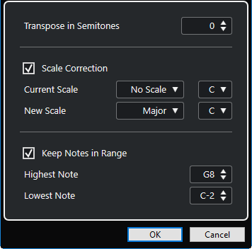 Pour ouvrir la boîte de dialogue Configuration de la transposition, sélectionnez les notes MIDI que vous souhaitez transposer, puis sélectionnez .