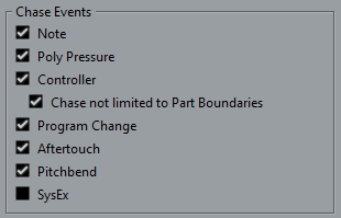 Il en va de même pour d'autres types d'événements. Dans la boîte de dialogue Préférences (page MIDI), la configuration du paramètre Suivre évts. détermine quels types d’événements sont suivis lorsque vous changez de position et démarrez la lecture.