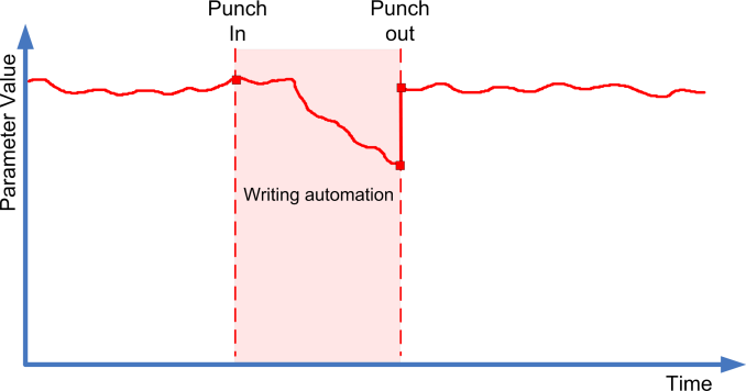 「タッチ (Touch)」モードではパラメーターコントロールを実際にタッチしている間だけ、オートメーションデータが書き込まれます。コントロールを放すと同時にパンチアウトとなります。