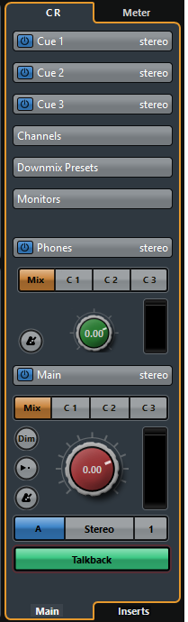 Die Einstellungen-Registerkarte im Control Room zeigt Informationen und Bedienelemente für die Kanäle an, die Sie im Fenster Audioverbindungen auf der Registerkarte Control Room definiert haben.