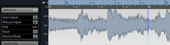 Im Projekt-Fenster wird das Audio-Event nun mit einem Noten- und einem Warp-Symbol angezeigt. Dies zeigt an, dass Time-Stretching angewendet wurde.