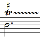 Indicates the trill interval using a small, parenthesized, stemless notehead shown in the staff immediately to the right of the first note to which the trill applies, and at the correct staff position for the trilled-to pitch. Auxiliary notes are used for all trill intervals that are not a major or minor second, but are automatically hidden for unison trills if the notehead design of the auxiliary note has not been overridden.