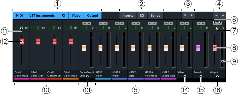 There is a mixer channel for each stereo output from the VST instruments in your project, and all instruments in your project are shown, even if they are spread across multiple VST instrument instances. Channels display the full instrument name set for that instrument in the Edit Instrument Names dialog and its instrument number, if applicable. Channels are stereo by default.