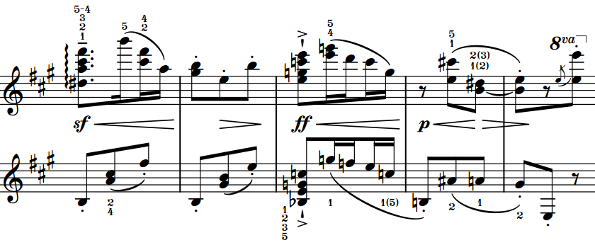 フィンガリングは、音符に使用が推奨される指をプレーヤーに指示するために楽譜に追加されます。これは、楽器習得中のプレーヤー向けの楽譜や、難しいパッセージで、特定のフィンガリングのパターンを使用すると音符の演奏が容易になる場合などに効果的です。