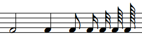 図: 2 分音符 (左) から 128 分音符 (右) までの、符尾の付いた音符