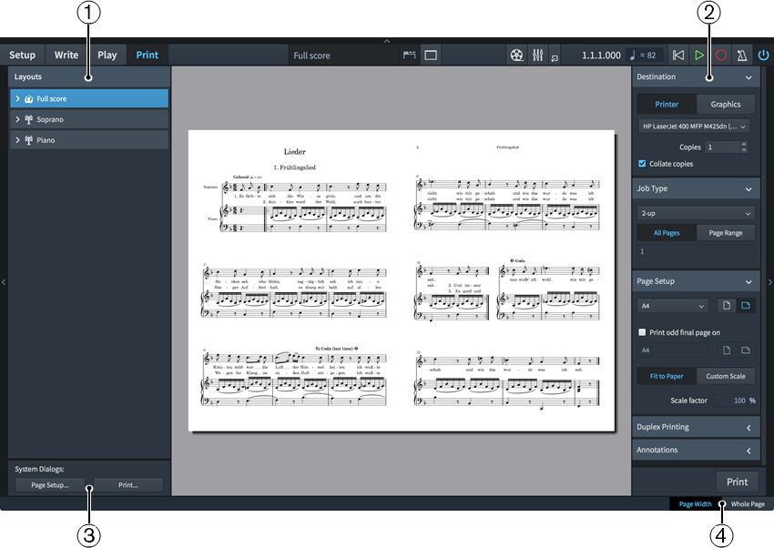 補足印刷モードでは、ツールバーのレイアウトセレクターが無効になります。印刷プレビュー領域で異なるレイアウトを確認する場合は、「レイアウト (Layouts)」パネルで選択します。