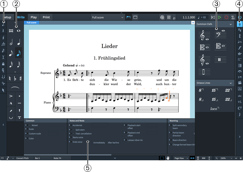 記譜モードのプロジェクトウィンドウには、初期設定ツールバー、楽譜領域、およびステータスバーが表示されます。ここには、楽譜を書くのに必要なツールや機能で構成されるツールボックスやパネルが表示されます。