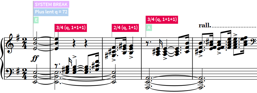 Signposts include a text summary of the hidden/invisible item to help you identify it. For example, time signature signposts include the time signature, expressed as a fraction, and its beat subdivision.