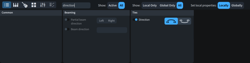 • Se sono stati selezionati più tipi di elementi di notazione diversi, vengono visualizzati esclusivamente i gruppi che questi hanno in comune. Ad esempio, se è stata selezionata una legatura di portamento, vengono visualizzati i gruppi Comune e Legature di portamento nel pannello delle proprietà. Tuttavia, se si seleziona una legatura di portamento e una nota, viene visualizzato solamente il gruppo Comuni.