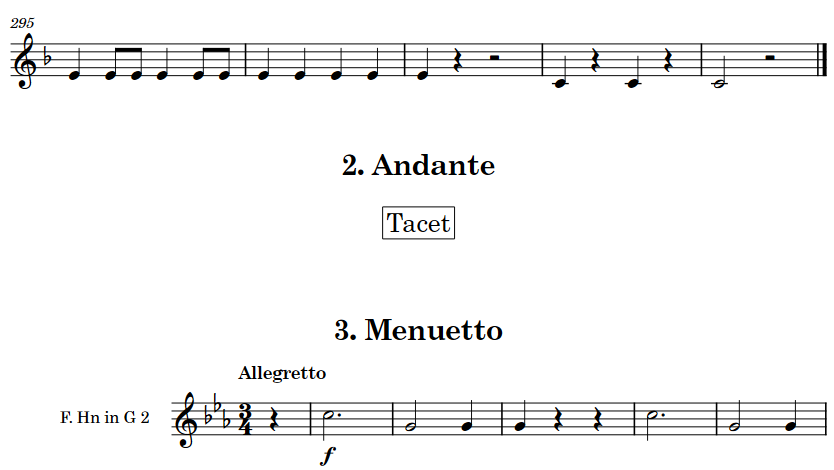 Mit Tacets wird angezeigt, dass ein Spieler in einem Teil einer Partie pausiert, wobei es sich z. B. um den Satz einer Symphonie oder ein Cue einer Filmmusik handeln kann. In Dorico Pro können Sie Tacets automatisch generieren.