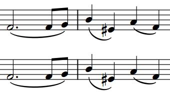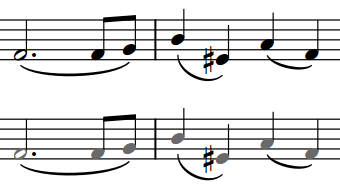 When unison range colors are shown, notes in unison ranges appear gray. Notes on the top staff remain black, as Dorico Pro notates real notes in tutti sections on the top staff in the section by default.