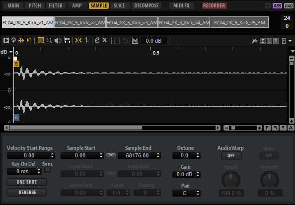 Die Sample-Registerkarte enthält den Sample-Editor. Im oberen Bereich der Registerkarte befindet sich die Mapping-Anzeige und die Wellenformanzeige und im unteren Bereich können Sie die wichtigsten Sample-Parameter anpassen.