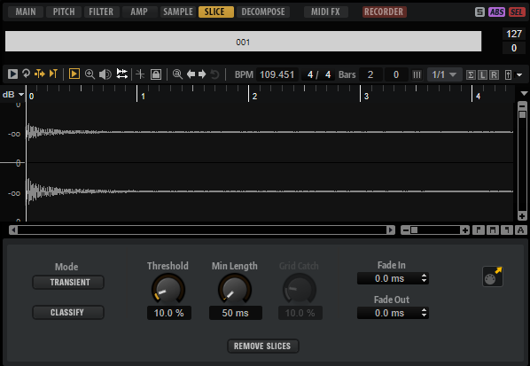 • Im Transient-Modus können Sie den niedrigsten Spitzenpegel einstellen, den ein Transient aufweisen muss, damit ein Slice-Marker gesetzt wird.