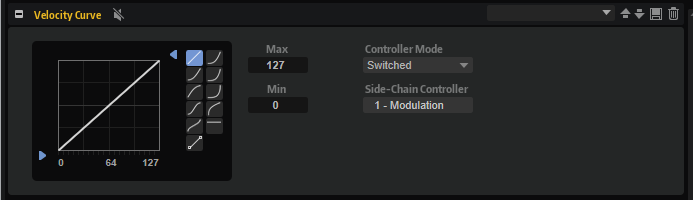 Le module Velocity Curve vous permet de mapper les valeurs de vélocité reçues sur des valeurs de sortie différentes par le biais d’une courbe ajustable.