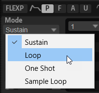 Select Loop to play back the envelope from the first node to the loop nodes. As a result, the loop is repeated for as long as you hold the key. When you release the note, the envelope continues playing the stages that follow the sustain. This mode is ideal for adding motion to the sustain of the envelope.