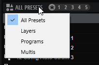 Le menu Preset Type permet d'opter pour l'affichage de tous les préréglages dans la liste des résultats ou uniquement des couches, des programmes ou des multis.