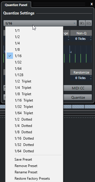 Arriba del Panel de cuantización se muestran los presets de cuantización. Aquí puede cargar y guardar presets que incluyan todos los ajustes de la cuantización.