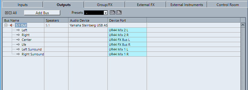サラウンドサウンドの作業を始める前に、選択したサラウンド形式のすべてのスピーカーチャンネルをルーティングするサラウンド出力バスの設定が必要です。