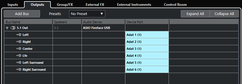 出力バスの設定 サラウンドサウンドの作業を始める前に、選択したサラウンド形式のすべてのスピーカーチャンネルをルーティングするサラウンド出力バスの設定が必要です。 図 1. 5.1 チャンネル構成の出力バス