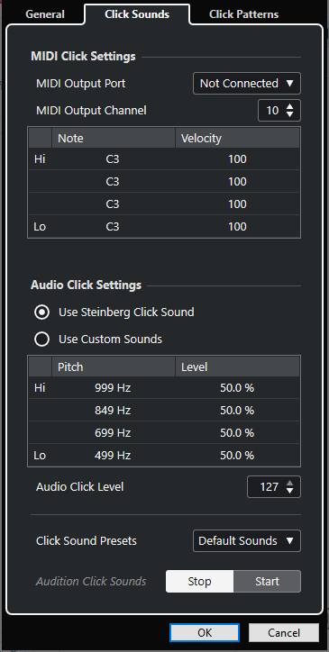 Im Bereich MIDI-Click-Einstellungen können Sie den MIDI-Click einrichten, der wiedergegeben wird, wenn Sie MIDI-Click verwenden im Bereich Click-Ziele auf der Allgemeines-Registerkarte aktivieren.