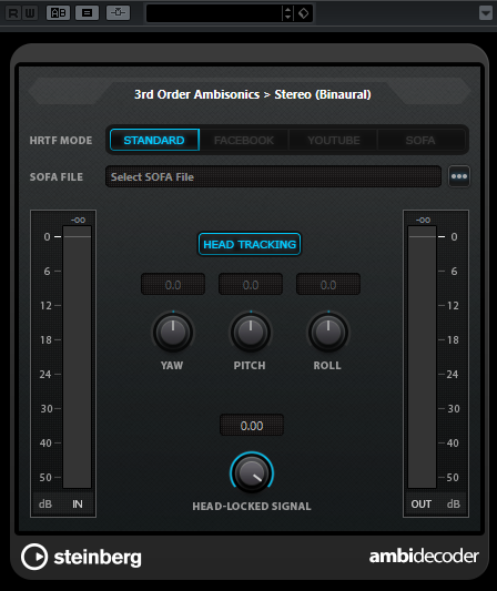 Wenn dieser Schalter aktiviert ist, empfängt der VST AmbiDecoder Head-Tracking-Daten aus dem Fenster Head Tracking. Wenn dieser Schalter deaktiviert ist, können Sie die Yaw-, Pitch- und Roll-Steuerelemente im Bedienfeld des VST AmbiDecoder nutzen, um die Drehwinkel einzustellen.