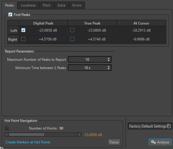 Zeigt den höchsten Spitzenpegel im analysierten Bereich an. Wenn Sie auf diesen Wert klicken, wird die Anzahl der in der Auswahl erkannten Spitzenpegel im Bereich Anzahl der Punkte unten links im Dialog angezeigt. Sie können die Hot-Punkte verwenden, um mit dem Positionszeiger von einem Spitzenpegel zum nächsten zu wechseln.