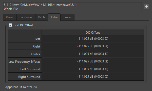 Diese Registerkarte zeigt den durchschnittlichen DC-Versatz des analysierten Abschnitts sowie die Wahrscheinliche Bittiefe.