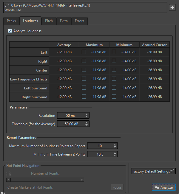 Auf dieser Registerkarte können Sie Einstellungen vornehmen, die Ihnen dabei helfen, Bereiche zu finden, die vom menschlichen Ohr als lauter oder leiser wahrgenommen werden. Um Abschnitte ermitteln zu können, deren Lautstärke sich deutlich wahrnehmbar von der Umgebung unterscheidet, muss ein längerer Audiobereich analysiert werden.