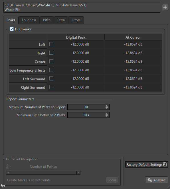 Die Felder unter Peaks zeigen den höchsten Spitzenpegel im analysierten Bereich sowie den Pegel des Samples am Positionszeiger auf der Wellenform zum Zeitpunkt der Analyse an.