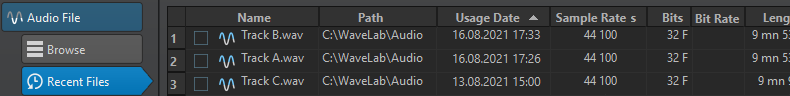 Auf dieser Registerkarte können Sie alle Dateien, die Sie zuletzt in WaveLab Elements verwendet haben, anzeigen und verwalten. Sie können Dateien suchen, mehrere Dateien zugleich öffnen und einzelne Dateien oder Dateien, die nicht gefunden werden können, entfernen.