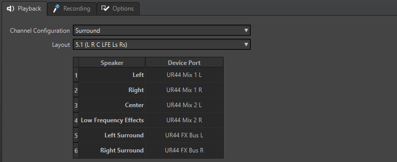Hiermit können Sie Geräteanschlüssen Wiedergabe-Busse zuweisen. Sie können zwischen Universell, Stereo, Surround und Ambisonics umschalten. In der Tabelle unterhalb des Kanalkonfiguration-Menüs können Sie den Geräte-Port für jeden Kanal eines Wiedergabe-Busses festlegen.