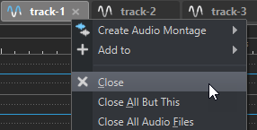 To close a file tab, click the X button of the corresponding tab, or press Ctrl/Cmd-W, or right-click the file tab, and select Close.