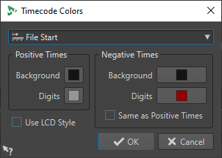 Opens the Timecode Colors dialog, where you can edit the colors of the Timecode window.