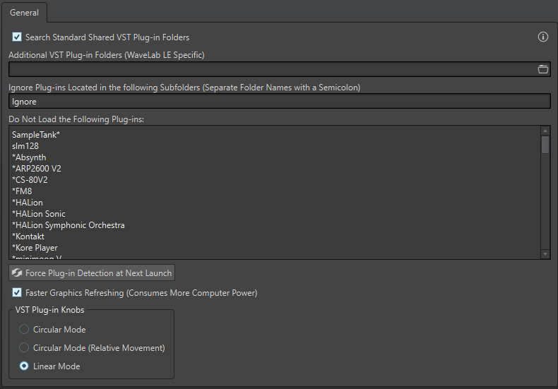 Sie können angeben, wo WaveLab LE nach Ihren VST-PlugIns suchen und welche es ignorieren soll. Hier können Sie auch auswählen, wie Ihre VST-PlugIn-Regler auf Mausbefehle reagieren und wie häufig Grafiken aktualisiert werden.