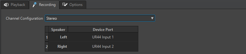 Hiermit können Sie Geräteanschlüssen Aufnahme-Busse zuweisen. Sie können zwischen einer Mono- und einer Stereo-Kanalkonfiguration umschalten. In der Tabelle unterhalb des Kanalkonfiguration-Menüs können Sie den Geräte-Port für jeden Kanal eines Aufnahme-Busses festlegen.