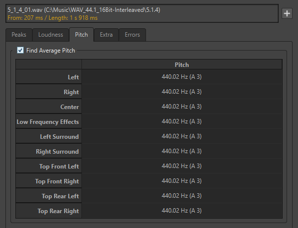 Sie können mithilfe der Einstellungen auf dieser Registerkarte Informationen für Tonhöhenkorrekturen sammeln, z. B. wenn Sie die Intonation eines Sounds besser an einen anderen anpassen möchten. Die Anzeige enthält die Tonhöhe für jeden Kanal, in Hertz (Hz) und in Halbtönen und Cents (Hundertsteln eines Halbtons). Da ein Gesamtwert für den ganzen analysierten Bereich angezeigt wird, können die Hot-Punkt-Bedienelemente im unteren Abschnitt des Dialogs auf dieser Registerkarte nicht verwendet werden.