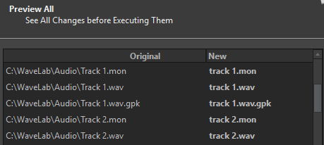 Auf der letzten Seite des Dialogs Umbenennen (Stapelbearbeitung) können Sie vor dem Start der Umbenennung sehen, wie alle ausgewählten Datei-, Clip- oder Markernamen geändert werden. Enthält der Name ein zufälliges Element, wird dessen Name wahrscheinlich in der Vorschau anders sein.
