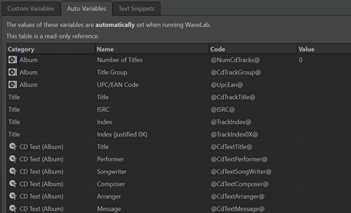Auf dieser Registerkarte können Sie benutzerdefinierte Variablen definieren, automatische Variablen anzeigen und Textbausteine definieren.