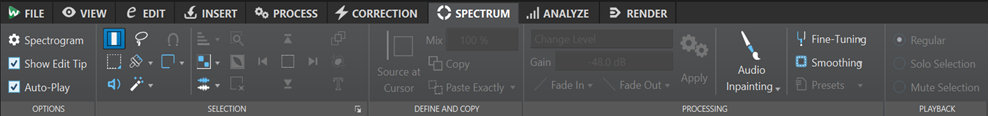 Auf der Spektrum-Registerkarte können Sie hochwertige Linearphasenfilter nutzen, um im Rahmen der Restauration und Bearbeitung von Audiomaterial ausgewählte Spektralbereiche zu bearbeiten.