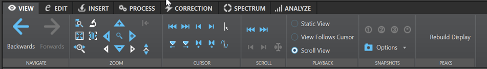 Beschreibungen der einzelnen Optionen finden Sie in den entsprechenden Abschnitten zur Ansicht-Registerkarte im Audio-Editor der Standalone-Version von WaveLab Pro.