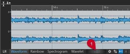 To overlay the Waveform or the Rainbow view with the RMS Loudness view, use the scroll wheel (1) at the bottom. The farther you turn the scroll wheel to the right, the higher the opacity of the RMS Loudness overlay (2); that is, the more prominent it becomes. The farther you turn the scroll wheel to the left, the more transparent the RMS Loudness overlay. Turning the scroll wheel all the way to the left sets the transparency to 100%, so that the RMS Loudness overlay is not visible.