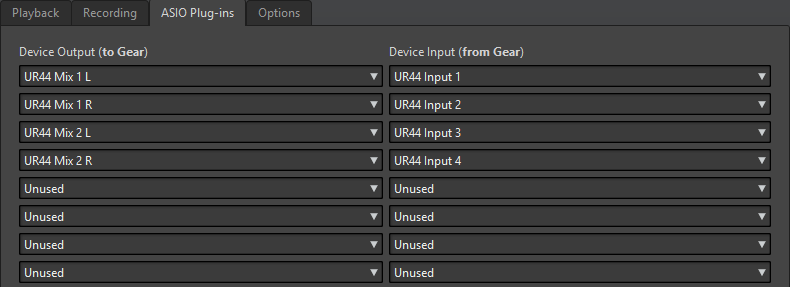 Auf dieser Registerkarte können Sie Eingänge von und Ausgänge zu externen Audiobearbeitungsgeräten auswählen. Der Name dieser Registerkarte entspricht dem installierten Treiber, z. B. ASIO-PlugIns.